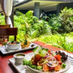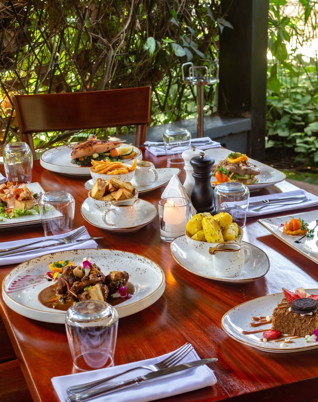 The restaurant is housed in a charming colonial-style building, blending modern luxury with vintage elegance. It features both indoor and outdoor seating, with a serene garden area perfect for a romantic dinner, casual brunch, or business meeting. Whether you’re seated inside by the warm lighting or outside under the stars, the atmosphere exudes a sense of exclusivity and tranquillity.